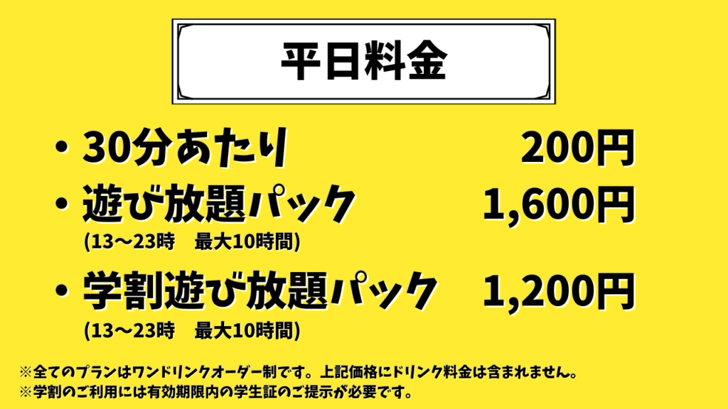 平日遊び放題パックは、まる1日遊んでも1600円だけ!(ワンドリンクオーダー制)